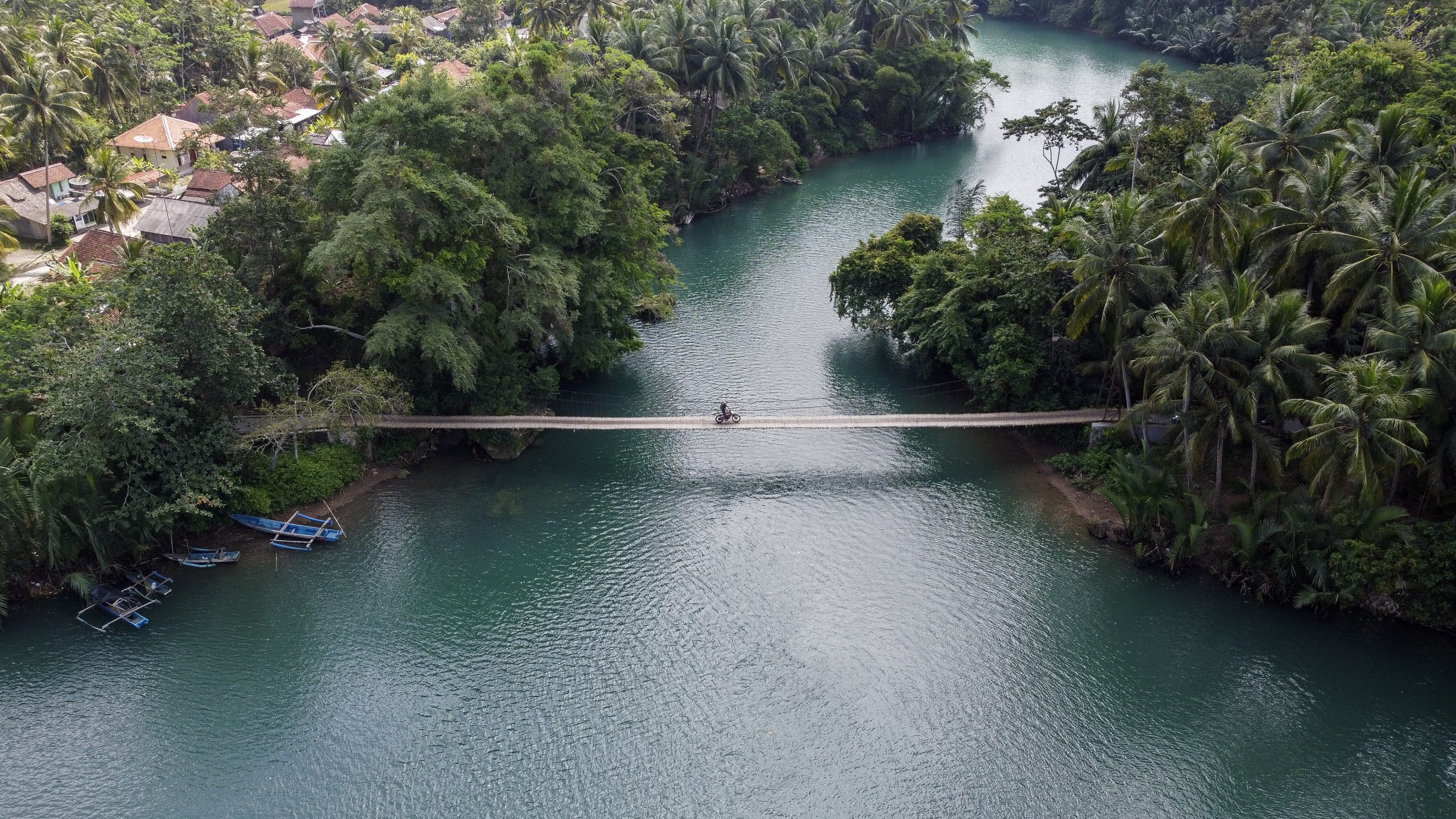 A Bridge Between Nature and LifeIn the heart of a lush tropical village, a narrow suspension bridge stretches across a calm river, connecting two worlds. Beneath it, the emerald waters reflect the sky, creating a peaceful and almost surreal atmosphere. A lone cyclist rides across, a symbol of the quiet journeys that shape daily life.Surrounded by towering palm trees and dense greenery, the river serves as both a lifeline and a sanctuary. Small wooden boats rest along the shore, hinting at the traditions and livelihoods of the local community. This image captures more than just a landscape—it tells a story of harmony between nature and human existence.In a fast-paced world, places like these remind us to slow down, breathe, and appreciate the beauty of simple moments.